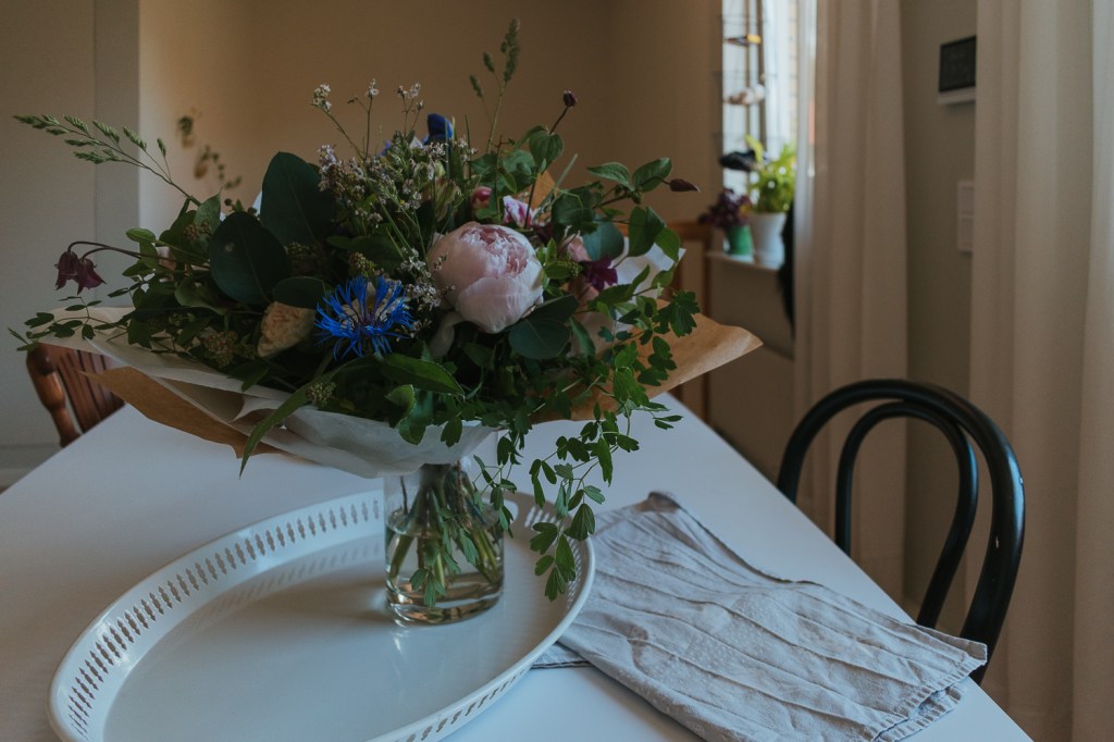 Buketten innehöll allt från maffiga pioner och fluffiga nejlikor till klematis, prästkragar och blåklint.