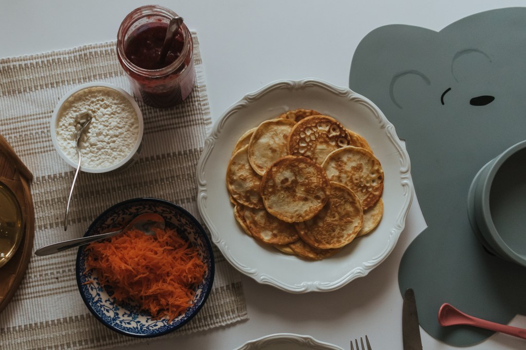 Till lunch gjorde jag plättar som serverades med keso, rivna morötter och hallonsylt.