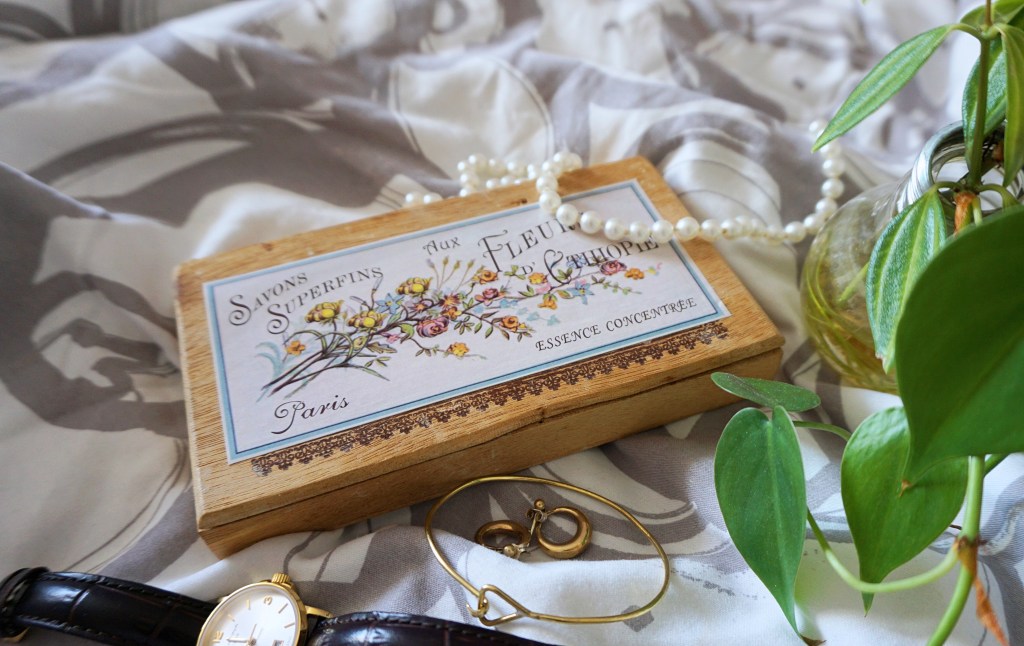 På nästa loppis fanns den här fina träasken som från början innehållit tobak. Perfekt för förvaring av smycken.